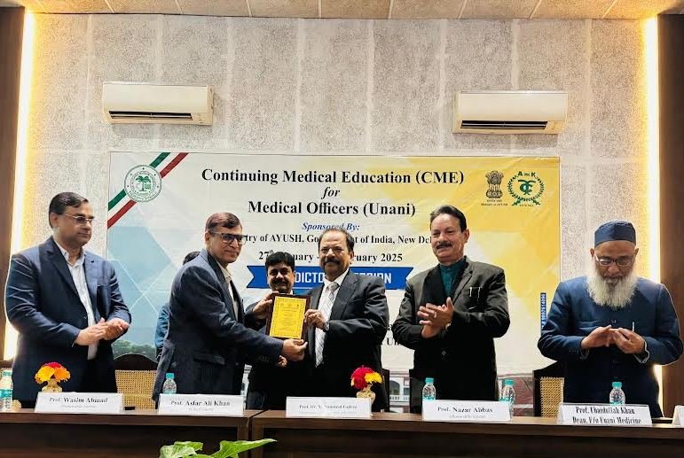 Aligarh : Department of Jarahat at Ajmal Khan Tibbiya College, Aligarh Muslim University (AMU, organized the valedictory session of the Continuing Medical Education (CME) program for Unani Medical Officers, sponsored by the Ministry of AYUSH, Government of India. The session, held at the Ajmal Khan Tibbiya College Auditorium, emphasized advancements in medical education and integration of technology in Unani medicine.