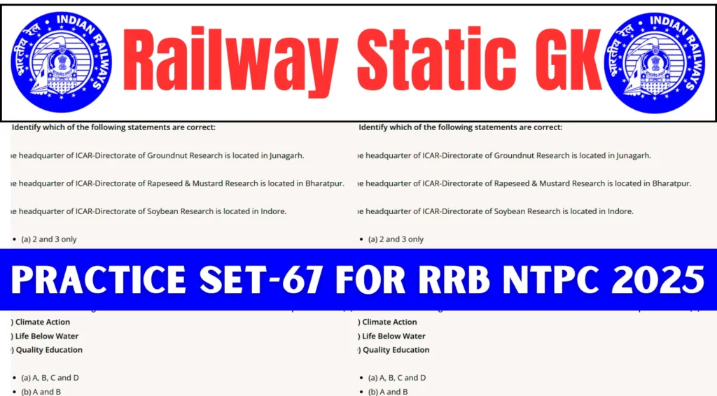 Railway Static GK Practice Set-67 for RRB NTPC 2025: Welcome to the Static GK Practice Set-67, designed specifically for aspirants preparing for the RRB NTPC 2025 examination. This set focuses on enhancing your knowledge of General Awareness, a crucial section in the RRB NTPC exam. The questions cover a wide range of topics, including Indian Railways, Indian Polity, History, Geography, Science, and Current Affairs, which are essential for scoring well in the exam.