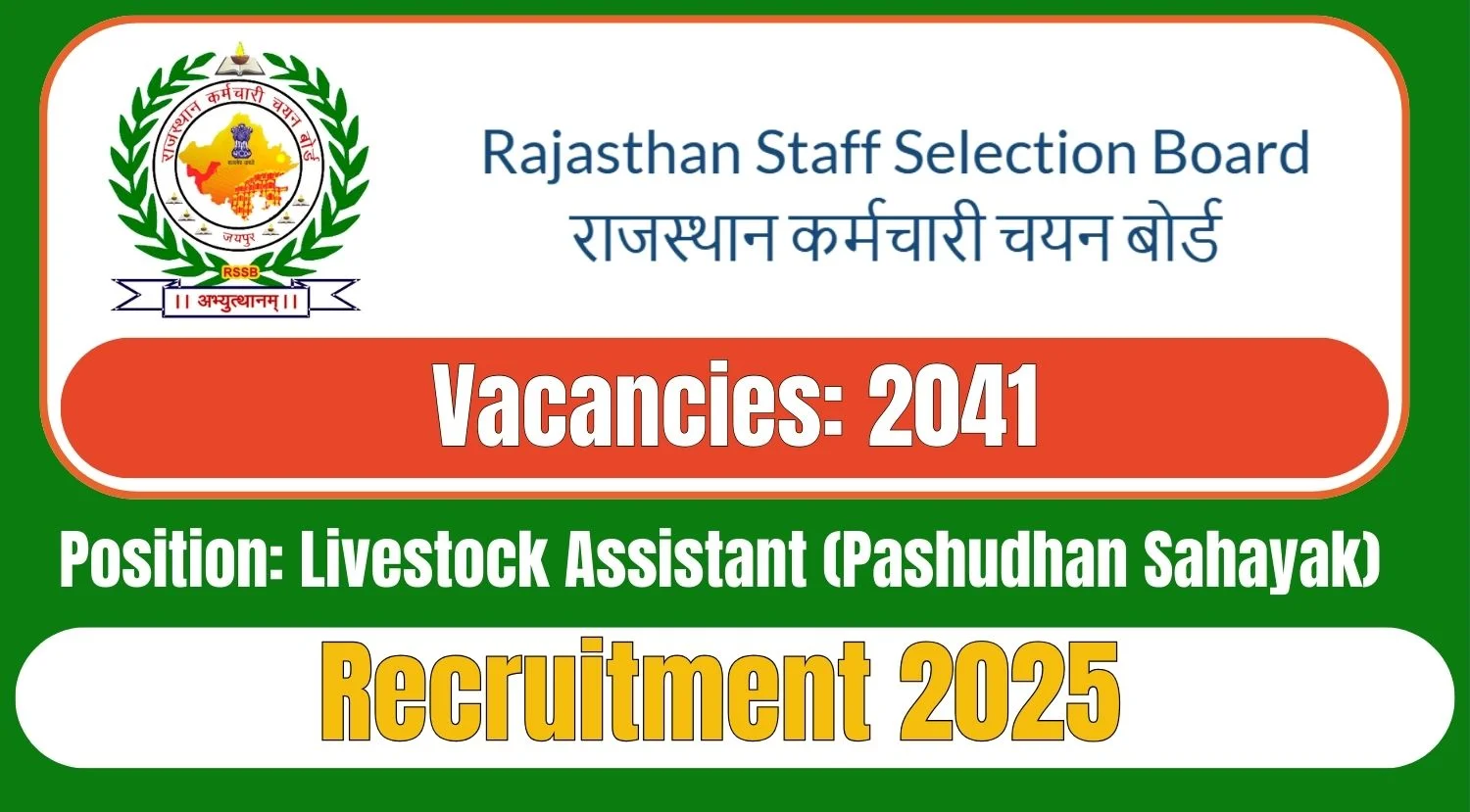 The Rajasthan Staff Selection Board, Jaipur (RSSB Jaipur) has announced the Rajasthan Livestock Assistant Recruitment 2025 for 2041 vacancies. If you are interested in working as a Livestock Assistant (Pashudhan Sahayak) in Rajasthan, this is a great opportunity for you.