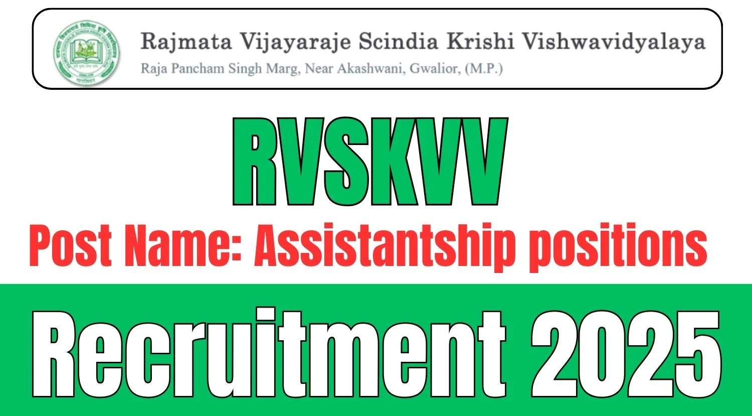 RVSKVV Recruitment 2025: Rajmata Vijayaraje Scindia Krishi Vishwavidyalaya (RVSKVV), Gwalior, has announced a recruitment drive for Assistantship positions in two sponsored research projects at R.A.K. College of Agriculture, Sehore. The selection will be conducted through a walk-in interview on February 7, 2025.