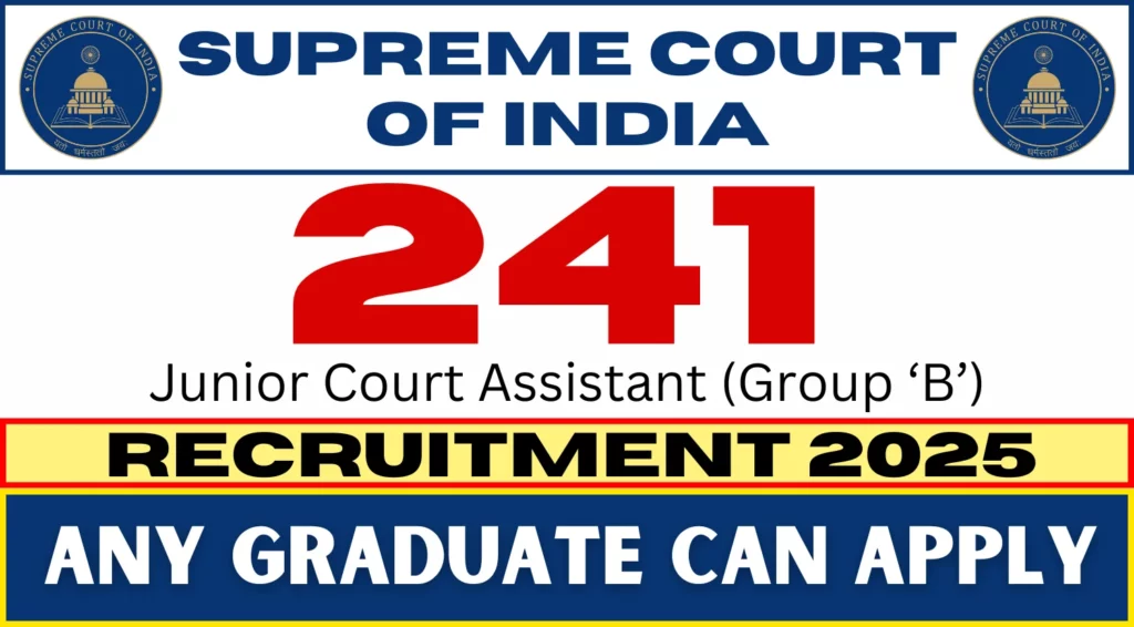 Supreme Court of India (SCI) JCA Recruitment 2025: The Supreme Court of India (SCI) has officially announced the recruitment for the post of Junior Court Assistant (Group ‘B’ Non-Gazetted). A total of 241 vacancies have been made available for eligible candidates.