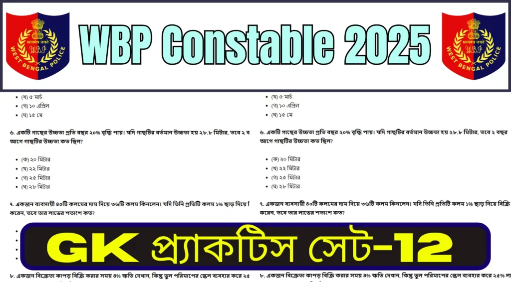 WBP Constable 2025 GK MCQs Practice Set-12:আপনার জন্য হাজির WBP কনস্টেবল ২০২৫ পরীক্ষার সাধারণ জ্ঞান (GK) MCQ প্র্যাকটিস সেট – ১২। এই সেটটি বিশেষভাবে প্রস্তুত করা হয়েছে পশ্চিমবঙ্গ পুলিশ কনস্টেবল পরীক্ষার জন্য, যাতে আপনি গুরুত্বপূর্ণ প্রশ্নোত্তর অনুশীলনের মাধ্যমে প্রস্তুতি আরও দৃঢ় করতে পারেন।