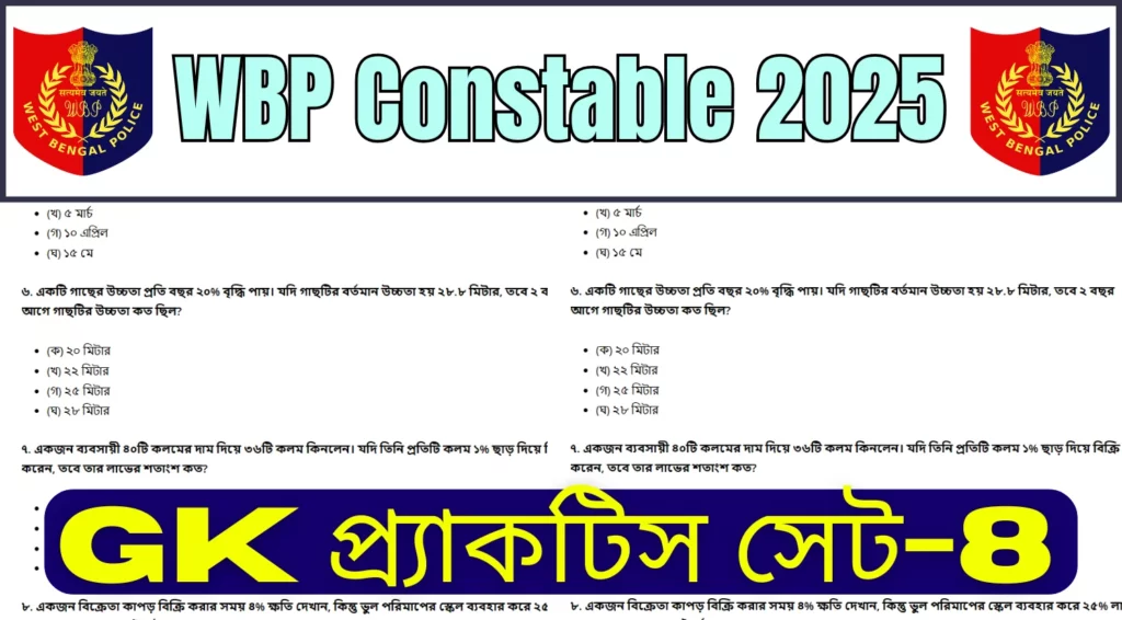 WBP Constable 2025 GK MCQs Practice Set-8: WBP কনস্টেবল ২০২৫ পরীক্ষার জন্য GK MCQs প্র্যাকটিস সেট তে আপনাকে স্বাগত জানাই। এই সেটে বাংলা বিষয়ক গুরুত্বপূর্ণ সাধারণ জ্ঞানের প্রশ্ন এবং উত্তর প্রদান করা হবে, যা পশ্চিমবঙ্গ পুলিশ কনস্টেবল পরীক্ষার প্রস্তুতির জন্য অত্যন্ত কার্যকরী।