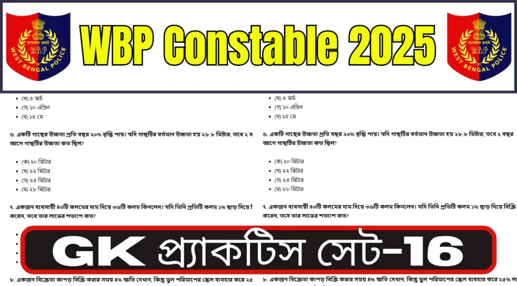 WBP Constable 2025 GK MCQs Practice Set-16: পশ্চিমবঙ্গ পুলিশ কনস্টেবল পরীক্ষা ২০২৫-এর প্রস্তুতির জন্য এই প্রশ্নোত্তর পর্বটি তৈরি করা হয়েছে।...