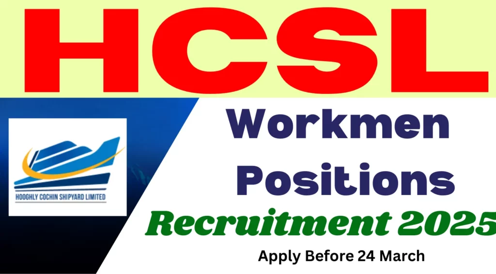 HCSL Recruitment 2025: The Hooghly Cochin Shipyard Limited (HCSL) is recruiting for 05 Posts of various workmen on a contract...