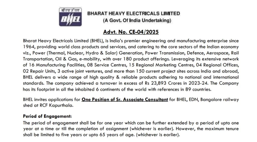 BHEL Sr Associate Consultant Recruitment 2025: Bharat Heavy Electricals Limited (BHEL) has released the Official Notification for the recruitment of...