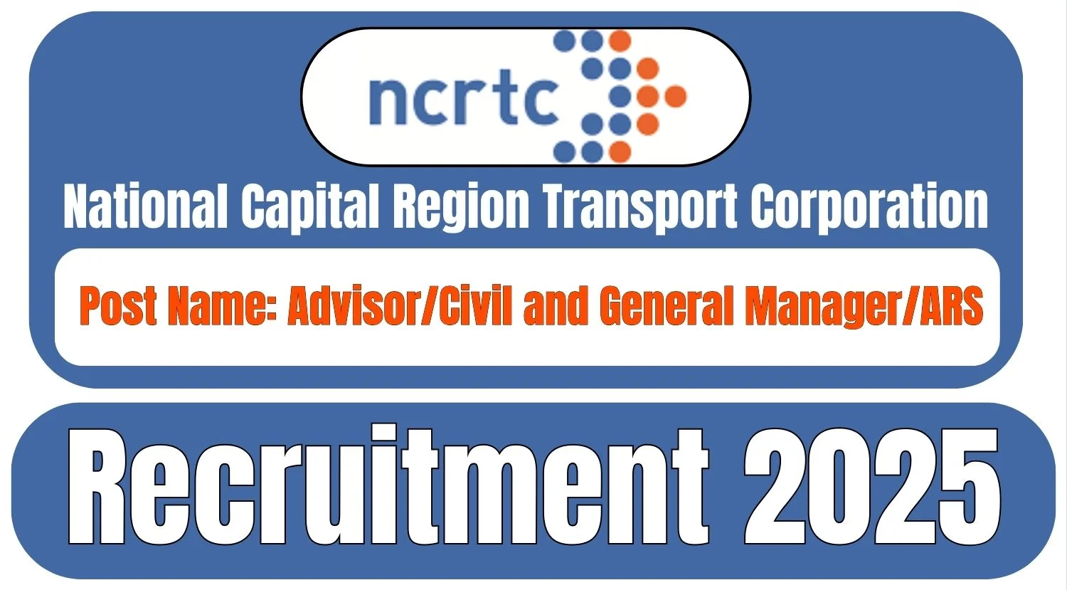 NCRTC Recruitment 2025 – The National Capital Region Transport Corporation has announced a notification for Advisor/Civil and General Manager/ARS post....