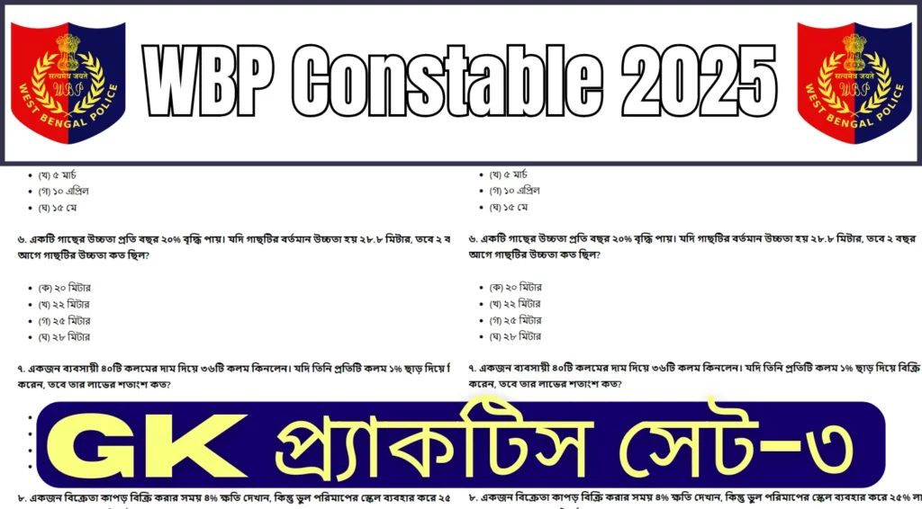 WBP Constable 2025 GK MCQs Practice Set-3: আপনারা যারা পশ্চিমবঙ্গ পুলিশ কনস্টেবল (WBP Constable) পরীক্ষার জন্য প্রস্তুতি নিচ্ছেন, তাদের জন্য...